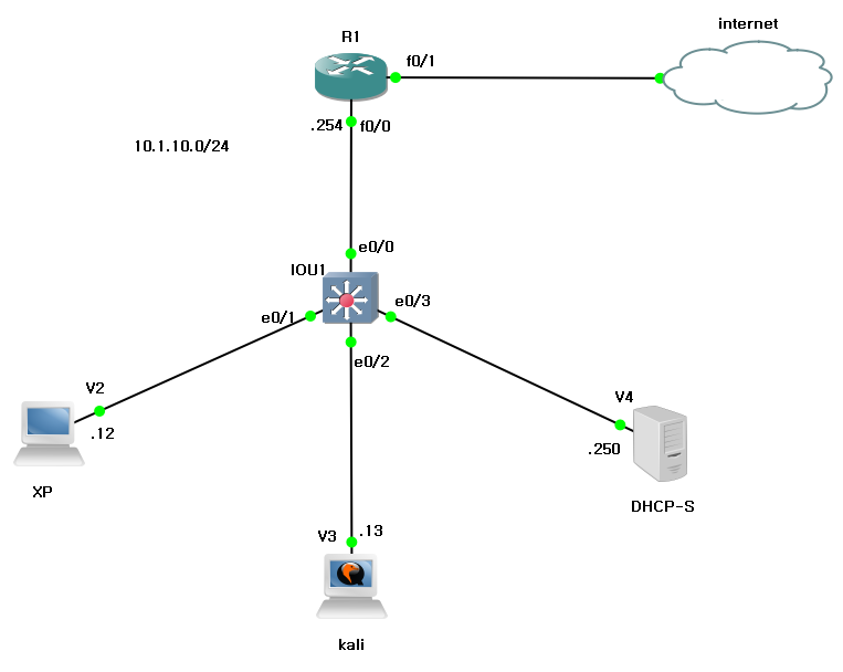위와 같은 토폴로지로 DHCP Spoofing Attack을 실습해보고 방어 대책 설정을 실습한다. R1은...