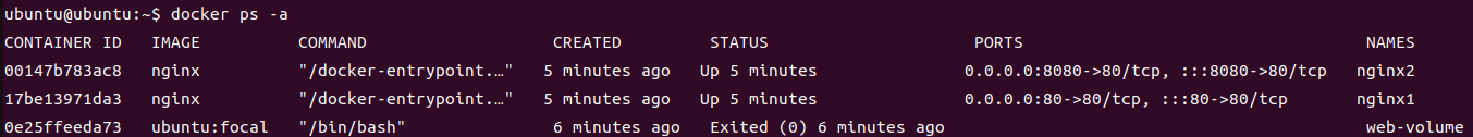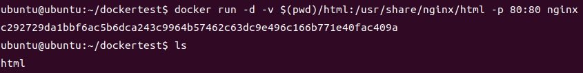 docker run -d -v $(pwd)/html:/usr/share/nginx/html --name web-volume ubuntu:focal