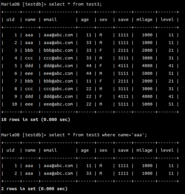 | name이 aaa인 레코드를 출력하시요 |