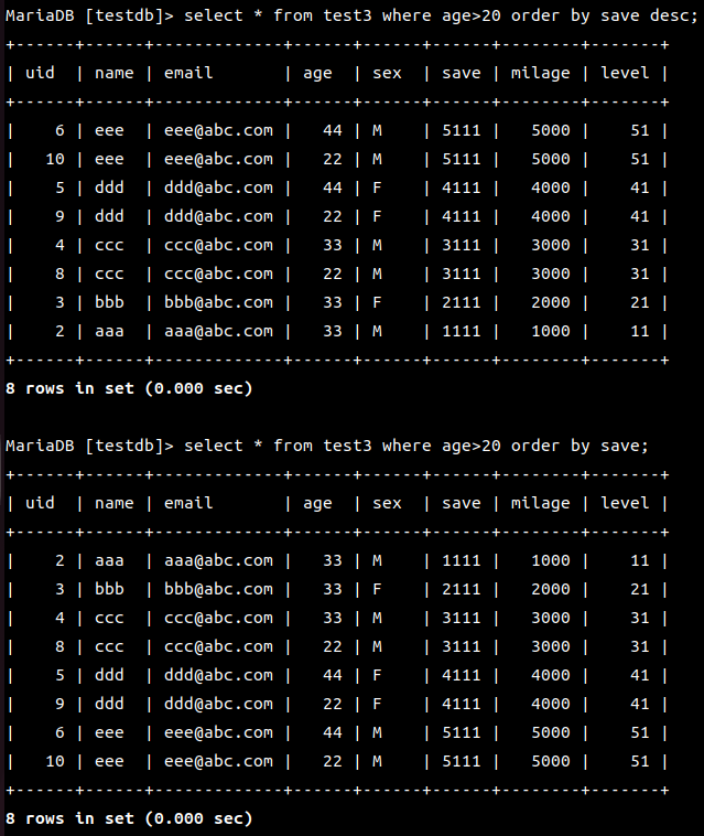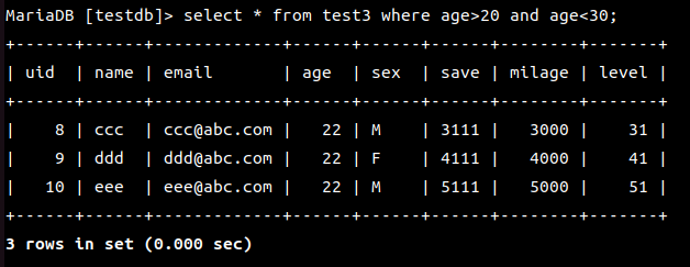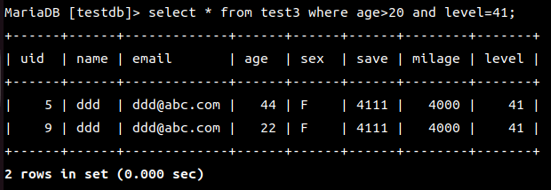 | name이 aaa인 레코드의 email와 age를 출력하시요 |
