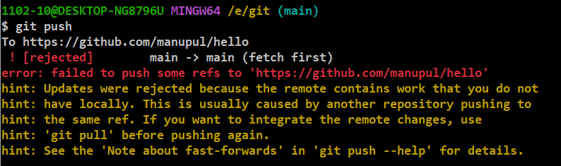 처음 오류 메시지가 나왔던 이유는 기존 데이터가 손실될 수 있어서 push를 막은 것이다.